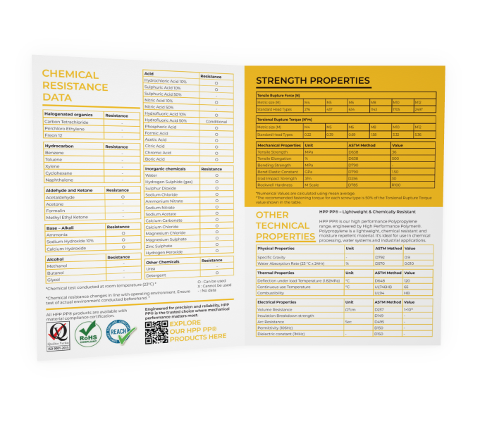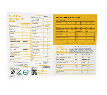 Hochwertiges A4-Datenblatt, das die wichtigsten Leistungsmerkmale von PP in einem übersichtlichen, professionellen Format präsentiert. Gedruckt auf 250 g/m² starkem Hochglanzpapier für Langlebigkeit und hochwertige Haptik, enthält es umfassende technische Daten zu mechanischen, thermischen, elektrischen und chemischen Eigenschaften.